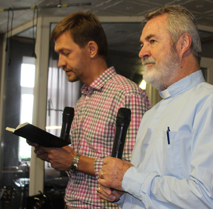 Rev. Dr. Leonardo Neitzel (right) preaches in Ukraine through a translator, LCC missionary Rev. Oleksiy Navrotskyy.