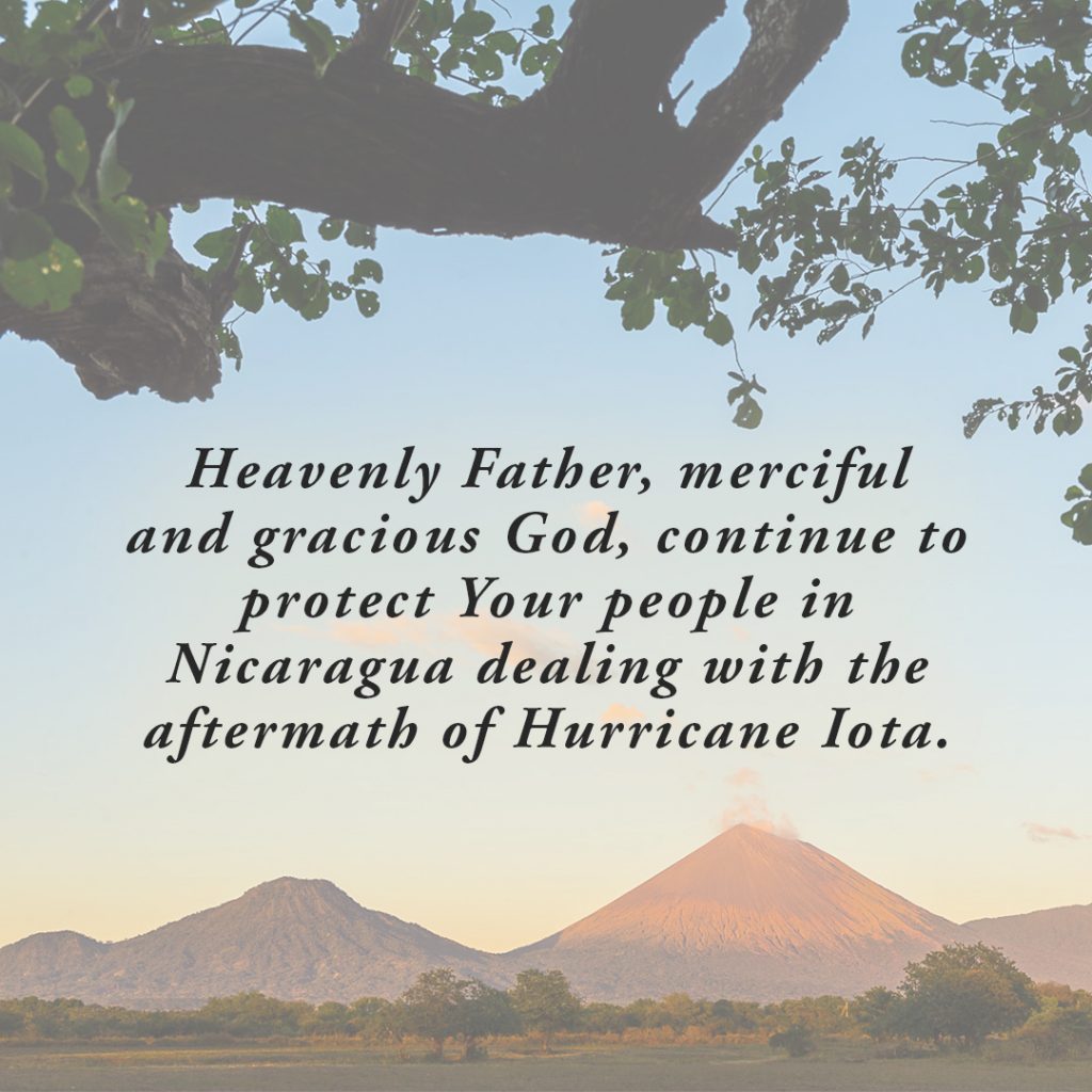 Heavenly Father, merciful and gracious God, continue to protect Your people in Nicaragua dealing with the aftermath of Hurricane Iota. Be with all aid workers as they tend to the physical needs of all people. Guide and direct Your Church that she may bring comfort and aid to those in need. And strengthen the faith of Your people that they may be comforted with the peace that only You can bring at this time; through Jesus Christ our Lord. Amen.